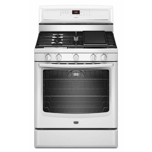 Maytag MGR8880AW 30 inch Freestanding White Gas Range featuring 5 Sealed Burners, 5.8 cu. ft. True Convection Oven, Integrated Griddle, Power Preheat, Hidden Bake Element, and Storage Drawer